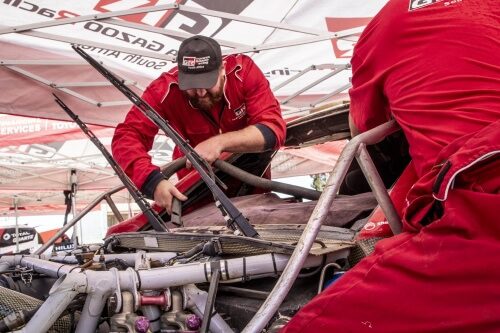 昼にTOYOTA GAZOO Racingのサービスへと戻って来たハイラックスは、フロントガラスを交換。限られた時間の中で車体のダメージ修復も行いました。イベント主催者の判断により、午後の2度目のループセクションは埃の少ない先頭でのスタートを切ることとなりました。