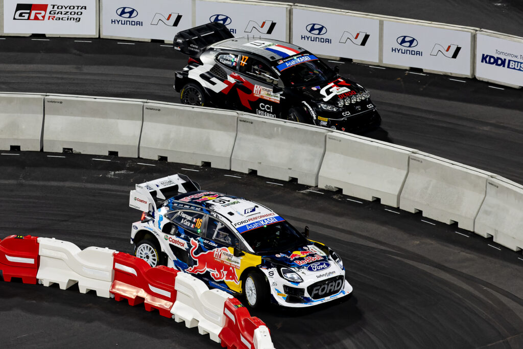 母国イベントで期待のかかる勝田貴元はドライバー選手権首位のティエリー・ヌービルと対戦。大勢の観客が見守る中、ヌービルよりも先にフライングフィニッシュを通過し、トップと0.8秒差の3番手タイムを記録しました。